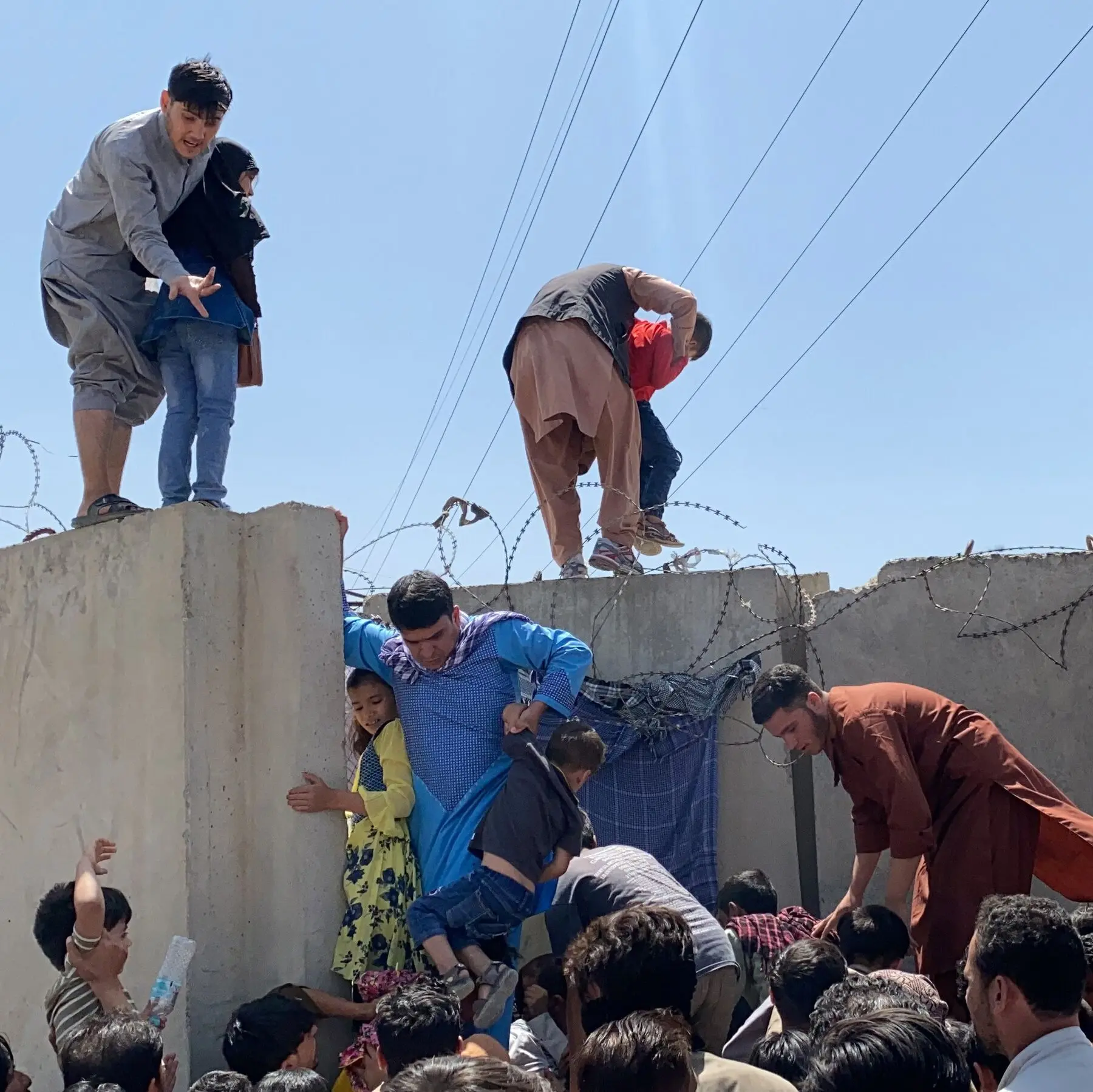 Người dân cố gắng trèo tường sân bay quốc tế Hamid Karzai để chạy trốn sau khi Taliban giành quyền kiểm soát Kabul. **Ảnh: EPA, Shutterstock**